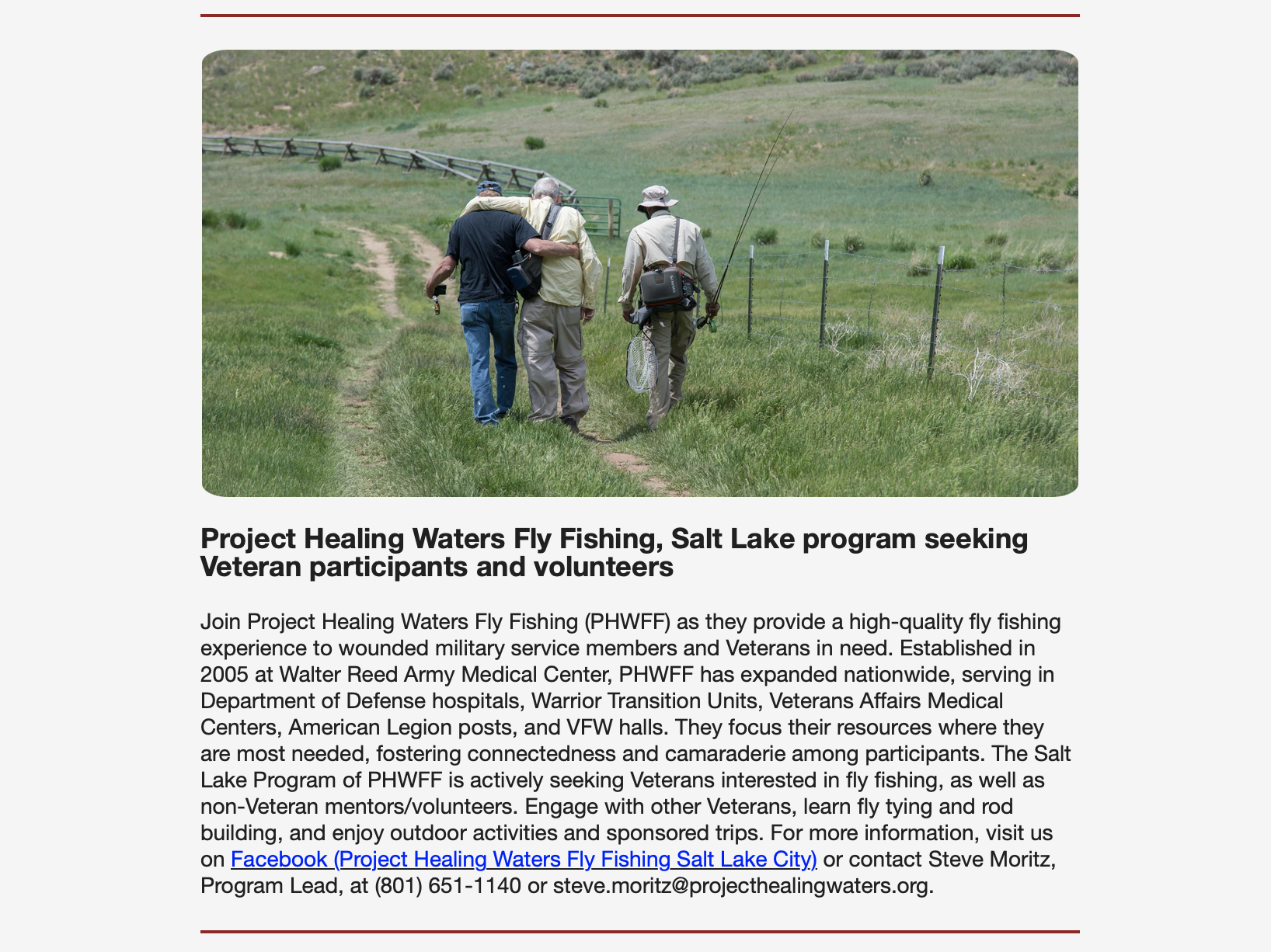 We often find that the #1 thing preventing people from engaging with Project Healing Waters is that they haven’t heard of us yet. There’s a wide range of opportunities for such outreach, from participation in local events to engaging new media outlets, and it’s always nice to see how programs successfully use these channels! Recently, PHW Salt Lake City, through Mark West and Program Lead Steve Moritz, were published in the Utah Department of Veterans and Military Affairs newsletter, resulting in interest from dozens of new Veteran participants and volunteers.
