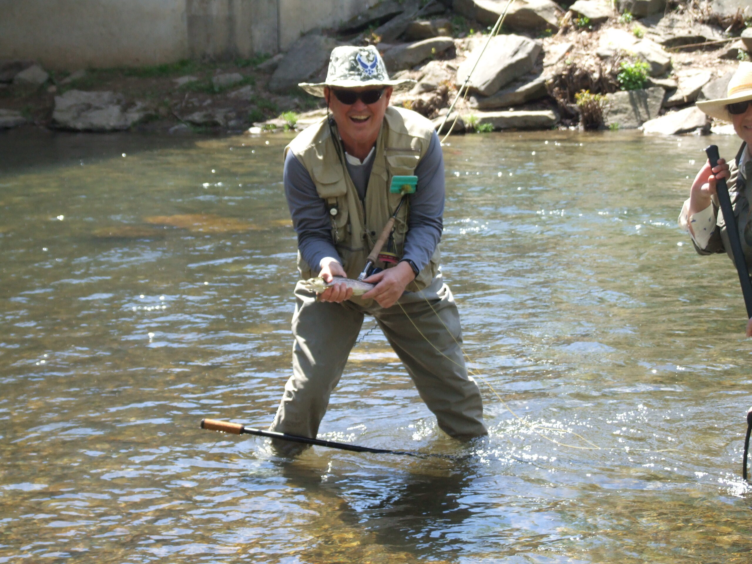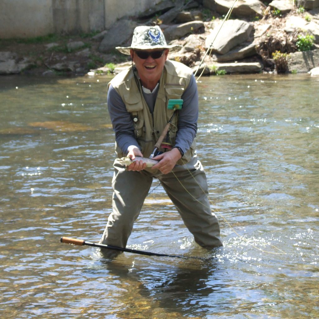 Everybody caught fish through the morning and into the afternoon. Ever-present as in past years were the locals who showed up to watch and cheer on the Veterans. The “Bridge Brigade,” as they have come to be known, take up a vantage point on the bridge over the stream watching all of the action from above. They always keep the Veterans entertained throughout the weekend. When asked why they come out to watch the day’s activities, Dan Morris, known affectionately as “Guru” for his ability to come up with innovative ways to create and build tools and gadgets that are handy for fly anglers and fly tiers, that he then generously passes out to anybody wanting them, said, “It’s an honor to be here. I learn so much from the Veterans about themselves and their experiences by talking to them”.